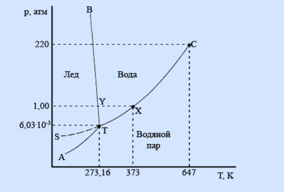 В точке Y на кривой ВТ лед находится в равновесии с водой при температуре 273 К (0°С) и давлении 1 атм. Она представляет собой точку замерзания воды при давлении 1 атм.