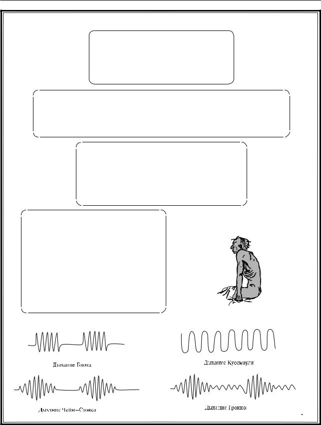 – дыхание Чейн–Стокса – глубина дыхания постепенно нарастает, но спустя около 10 дыхательных циклов начинает убывать и в конце концов переходит в апноэ (до 1 мин), затем цикл повторяется;