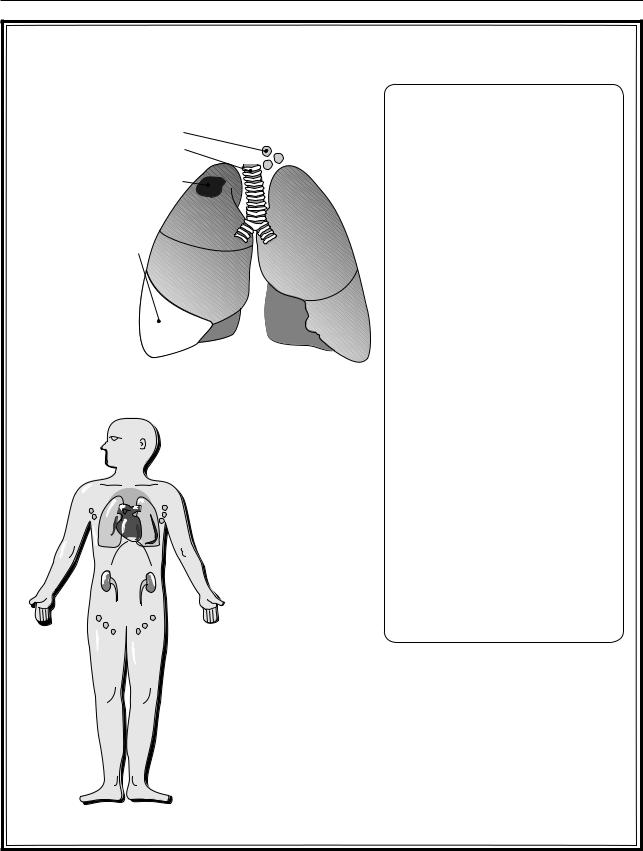 –повышение температуры тела (у 40–80% больных), что связано с задержкой мокроты и ее инфицированием при обтурации просвета бронха опухолью, а также интоксикацией организма продуктами распада опухоли. Рак легких может манифестировать острой пневмонией, однако появление затяжной или рецидивирующей пневмонии у мужчин старше 45 лет, особенно курящих, позволяет предположить опухоль легкого.
