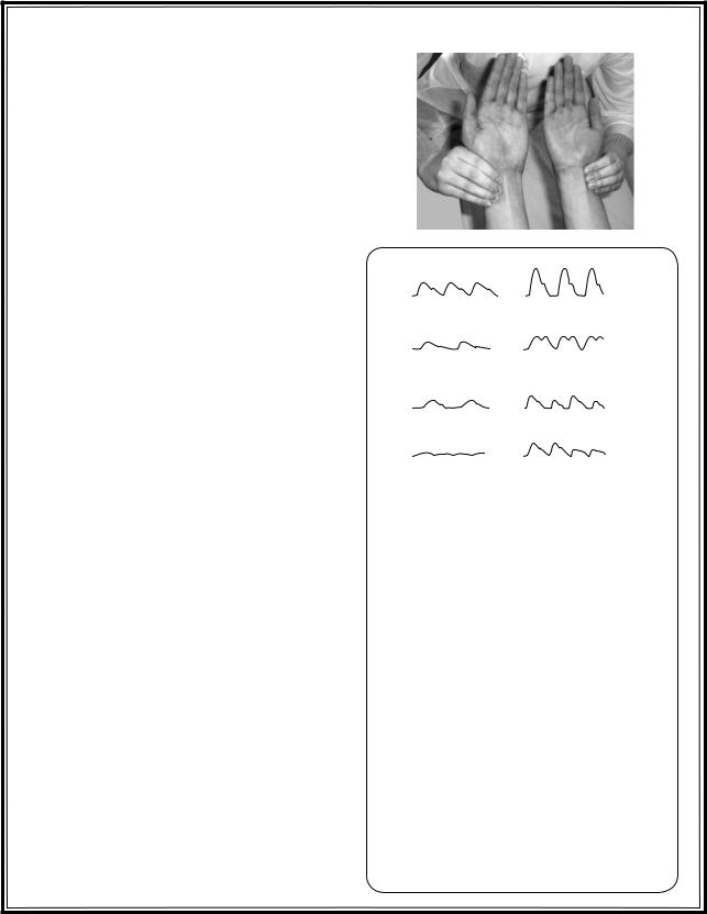 Затем приступают к подробному изучению пульса на одной руке, обычно левой. Частоту пульса определяют путем подсчета пульсовых ударов за 15–30 с с умножением полученного значения соответственно на 4 или 2. При неправильном ритме следует подсчитывать пульс в течение целой минуты.