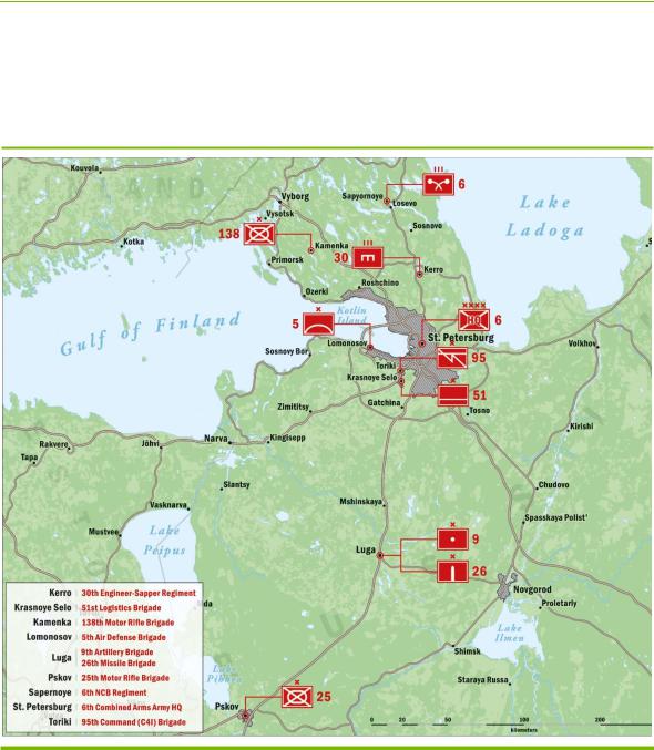The 6th Combined Arms Army is headquartered in St. Petersburg and is composed of nine brigades and regiments. Figure 5 shows the locations of the 6th Combined Arms Army units.