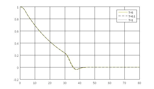 Исследуем влияние периода квантования на устойчивость системы “в малом”. Подадим на вход системы управляющее воздействие, не выходящее за пределы линейной зоны нелинейного элемента, и построим переходные характеристики ШИМ при различных значениях периода квантования.