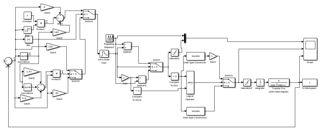 При анализе проектируемой системы необходимо согласовать характеристики звена с насыщением и широтно-импульсного модулятора в соответствии со структурной схемой, представленной на рисунке 6.3, где СПС – это система с переменной структурой, представленная схемой на рисунке 4.5, РР – релейный регулятор, представленный на рисунке 5.1, ОУ – исследуемый объект управления, сигнал на выходе которого зависит от устройства переключения SWITCH с условием |u|.
