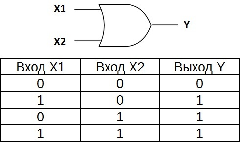Таблица истинности для элемента «2ИЛИ» показывает, что для появления на выходе логической единицы, достаточно чтобы логическая единица была на первом входе ИЛИ на втором входе. Если логические единицы будут сразу на двух входах, на выходе также будет единица.