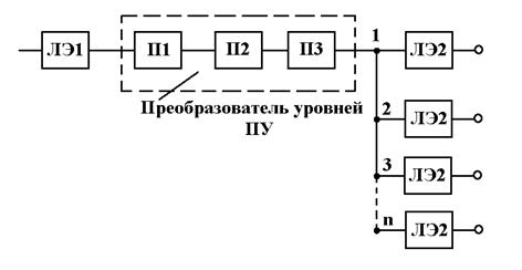 Основным элементом схемы согласования является преобразователь уровня ПУ. Входной П1 и выходной П3 каскады обеспечивают согласование выходов ЛЭ1 со входом П2 и выхода П2 со входом ЛЭ2.