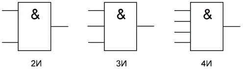 Условные обозначения логических элементов «И» с разным количеством входов приведены на рисунке. В тексте логический элемент «И» с тем или иным числом входов обозначается как «2И», «4И» и т. д. - элемент «И» с двумя входами, с четырьмя входами и т. д.