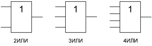 «ИЛИ» - логический элемент, выполняющий над входными данными операцию дизъюнкции или логического сложения. Так же как и элемент «И» выпускается с двумя, тремя, четырьмя и т. д. входами и с одним выходом. Условные обозначения логических элементов «ИЛИ» с различным количеством входов показаны на рисунке. Обозначаются данные элементы так: 2ИЛИ, 3ИЛИ, 4ИЛИ и т. д.