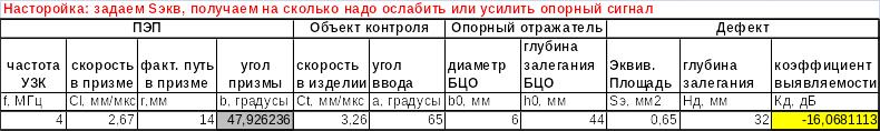 Рассчитанный коэффициент добавляем (или вычитаем) к опорному сигналу полученному от бокового цилиндрического отверстия в СО-2 диаметром 6 мм, расположенного на глубине 44 мм.