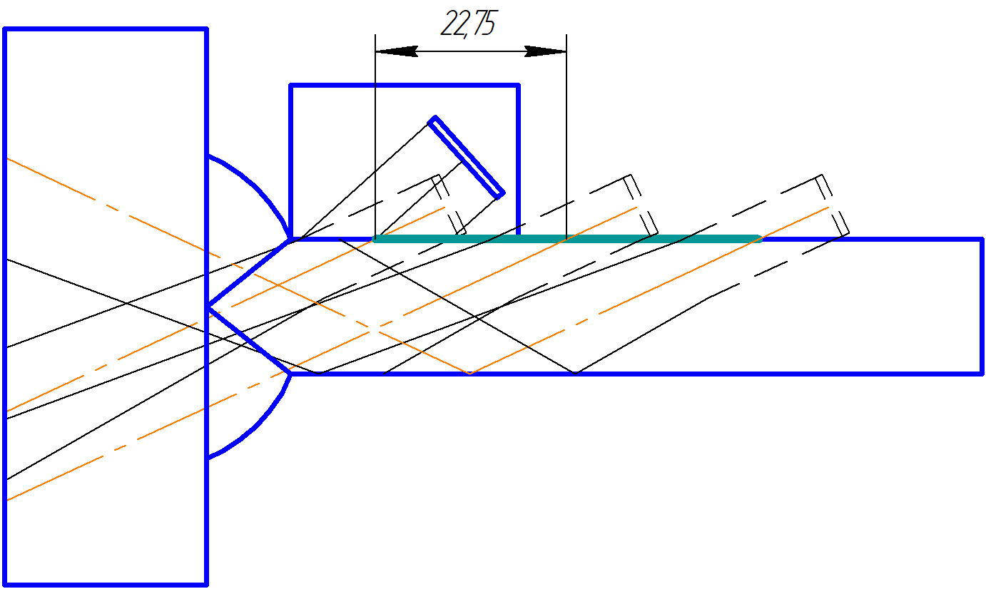 УЗ-контроль сварных швов малых толщин наиболее эффективен, если он выполняется специальными преобразователями с большими углами призмы и малой стрелой. Поэтому для контроля данного сварного соединения был выбран преобразователь с номинальной частотой 4 МГц.
