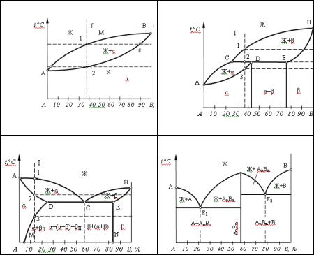 40. На каком рисунке изображена диаграмма состояния сплавов, образующих ограниченной растворимостью в твердом состоянии, с перитектикой?: