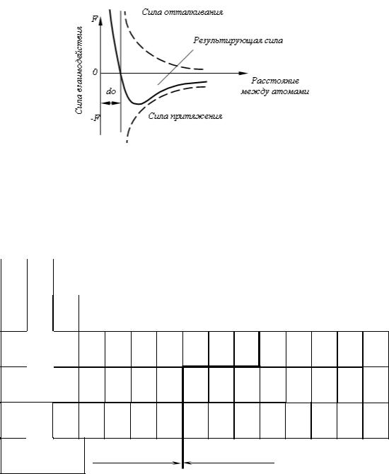 Сила связи в металлах определяется соотношением между силами отталкивания и силами притяжения между ионами и электронами. Атомы (ионы) располагаются на таком расстояния один от другого, чтобы энергия взаимодействия была минимальной. Этому положению соответствует равновесное расстояние d0 (рис. 1.1).