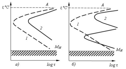 ся такой же, как и для углеродистой стали. Введение же карбидообразующих элементов (хром, вольфрам, молибден) изменяет вид С– образной области – выделяются области диффузионного и частично диффузионного превращений и между этими областями аустенит может иметь аномально высокую устойчивость.