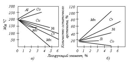 Рис. 9.4. Влияние легирующих элементов на температуру мартенситного превращения (а) и количество остаточного аустенита (б) в стали с 1, 0 % углерода
