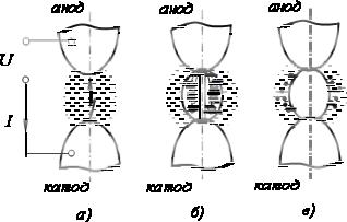 Рис 10.5. Схема физических процессов в межэлектродном промежутке при электроискровом легировании: а) этап оплавления; б) электрическая эрозия;