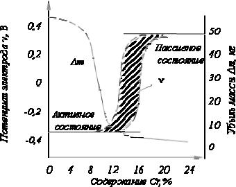 Рис. 12.1. Изменение электродного потенциала сплавов Fe–Cr и коррозия сплавов в растворе азотной кислоты