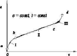 ипластической деформации, вызванной мгновенным приложением нагрузки; затем следует участок аb, на котором металл деформируется с неравномерной и замедляющейся скоростью (стадия неустановившейся ползучести) и участок bс, характеризующийся равномерной скоростью ползучести (стадия установившейся ползучести).