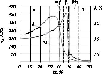 Рис. 15.4. Влияние содержания цинка на свойства латуней