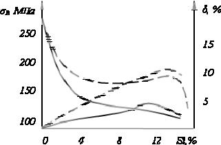 Рис.16.6. Зависимость механических свойств для модифицированного (штриховые линии) и немодифицированного (сплошные линии) силумина от содержания кремния