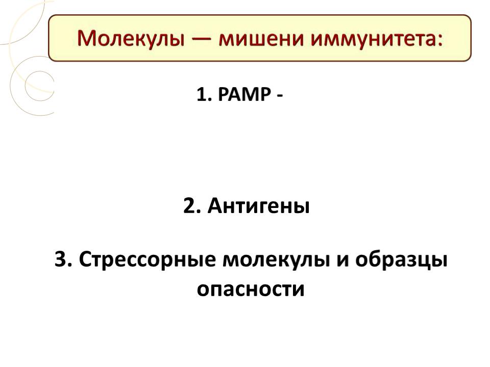 группы молекул, отсутствующие в организмехозяина, но характерные для отдельных групп микроорганизмов, связанные с их патогенностью и заведомо опасные; не являются индивидуальными (эндотоксины Грамбактерий, пептидогликан, микробные нуклеиновые кислоты или белки - флагеллин, профилин и др.)