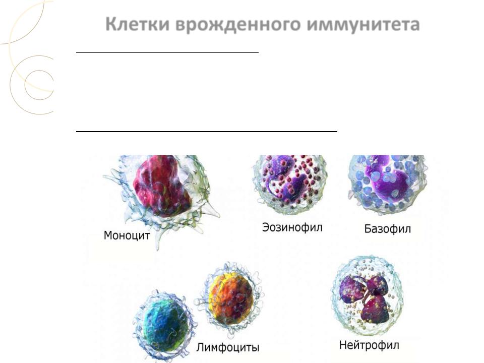 1.клетки миелоидного ряда (сегментоядерные лейкоциты — нейтрофилы, эозинофилы, базофилы; моноциты/макрофаги, дендритные клетки, тучные клетки)