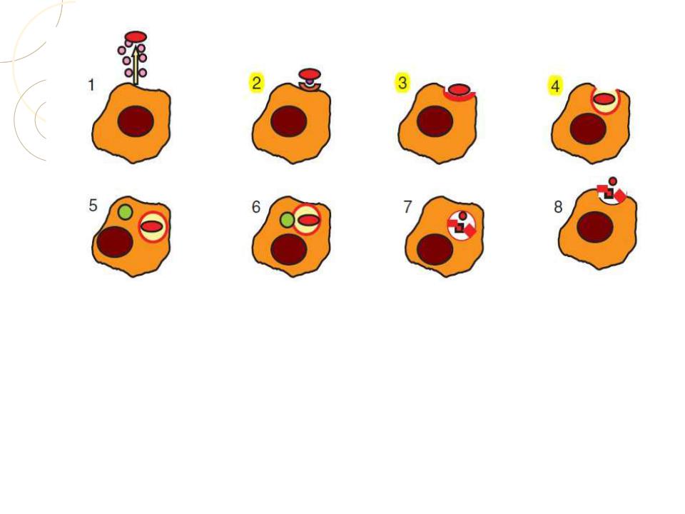 1 — хемотаксис, 2 — адгезия, 3 - активация мембраны, 4 – погружение, 5 - образование фагосомы, 6 - образование фаголизосомы, 7 - киллинг и переваривание, 8 - выброс продуктов деградации
