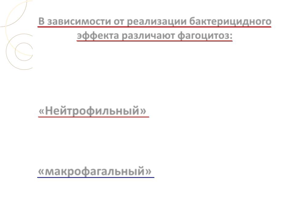 В зависимости от реализации бактерицидного эффекта различают фагоцитоз:
