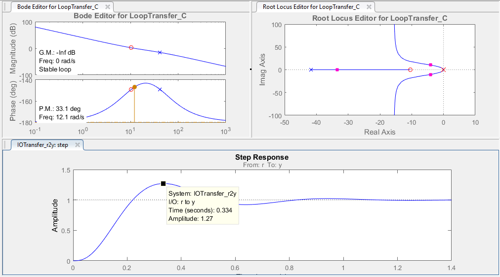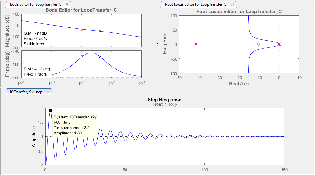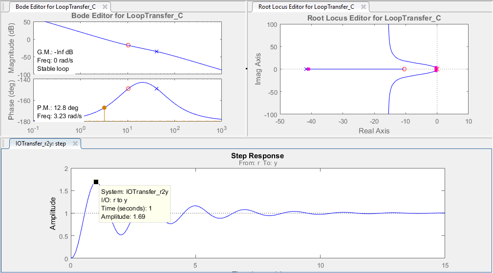За допомогою sisotool можна встановлюється зв'язок між кривими кореневого годографа (розташуванням коренів на площині, коренів у функції коефіцієнта посилення), логарифмічними характеристиками (що характеризуються частотою зрізу і запасом по фазі) і кривої перехідного процесу (яка характеризується величиною перерегулирования).