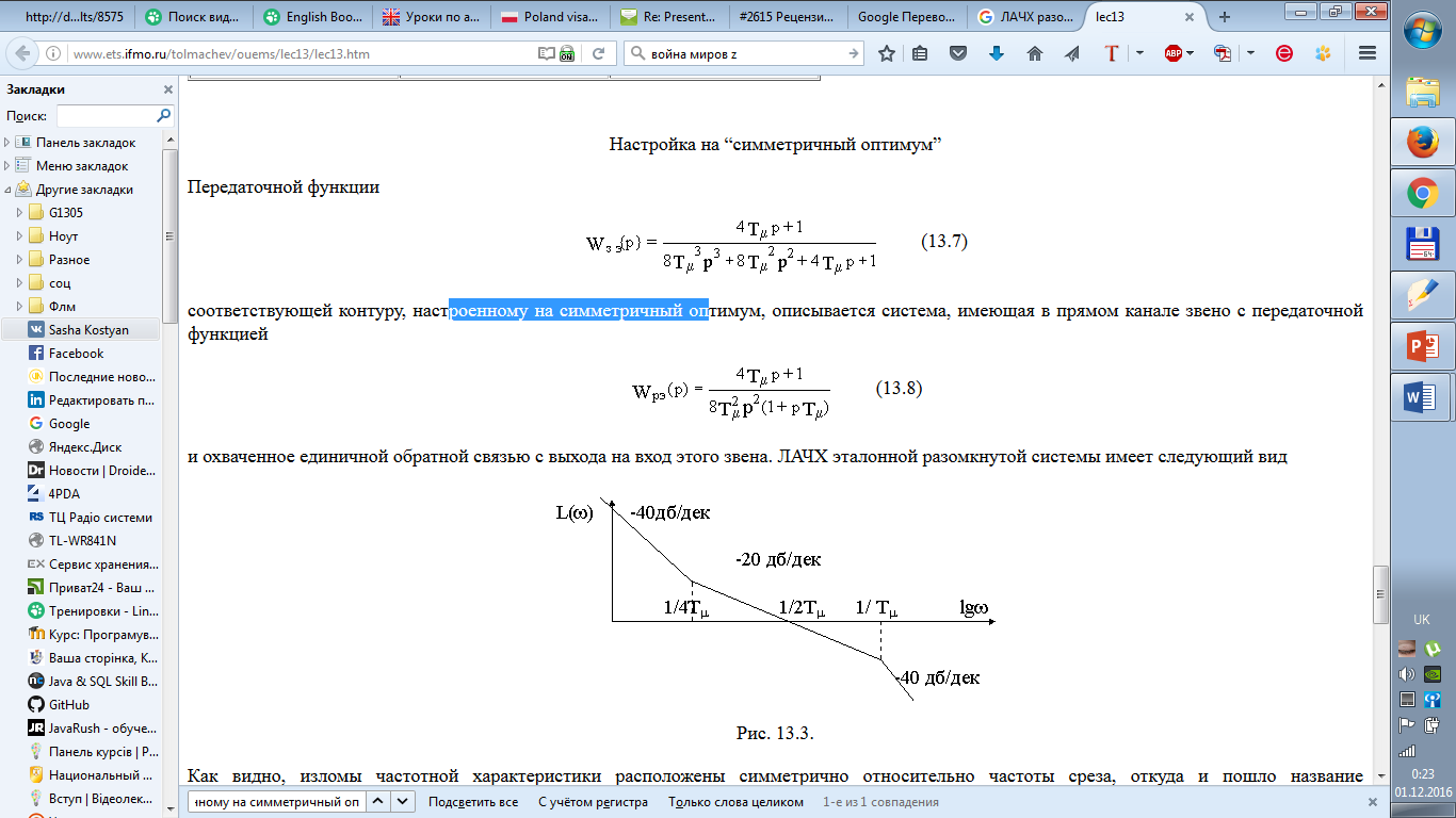 Висновки: На лабораторній роботі були вивчені можливості команди sisotool при дослідженні систем регулювання, взаємозв'язку між розташуванням коренів (метод кореневого годографа), характеристиками в частотної області (метод логарифмічних характеристик) з перехідними характеристиками системи, вплив коефіцієнта посилення розімкнутої системи на динамічні характеристики системи, налаштованої на симетричний оптимум. А також вивчені впливу параметрів фільтрів на вході системи регулювання і в колі зворотного зв'язку на траєкторії кореневого годографа і на частотні і тимчасові характеристики системи.