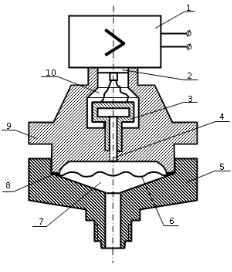 Мембранный тензопреобразователь 3 размещен внутри основания 9.
