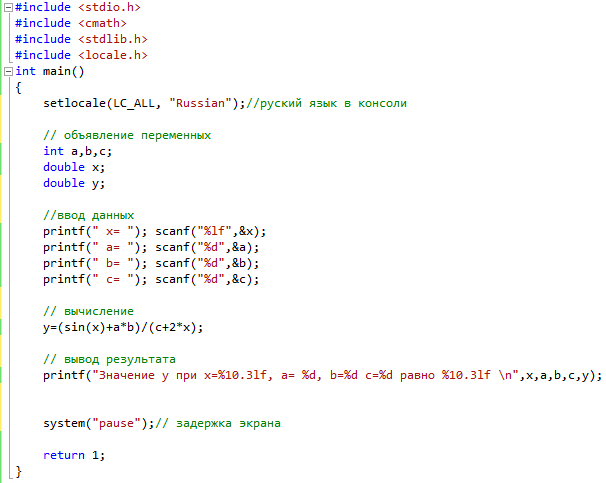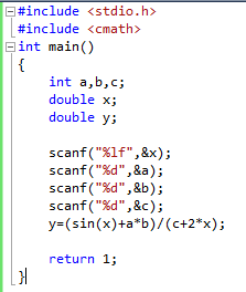 После чтения значений переменных организуем расчет формулы. Заметим, что для использования функции вычисления синуса числа нам потребуется подключить библиотеку “math.h”, содержащую определение математических функций.