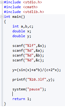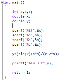 Теперь следует переписать переменную в линейном виде, используя арифметические операции языка СИ и математические функции, обращая внимание на порядок скобок в записи выражения.