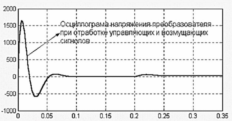 Рисунок 8. в - Зміна напруги перетворювача при подачі керуючого і обурюючого впливів з фільтром в каналі задання швидкості