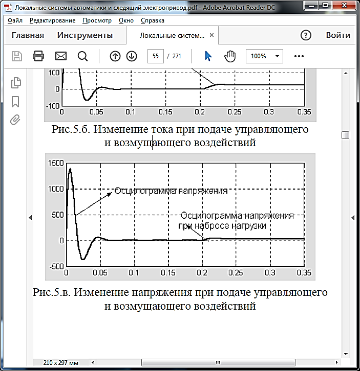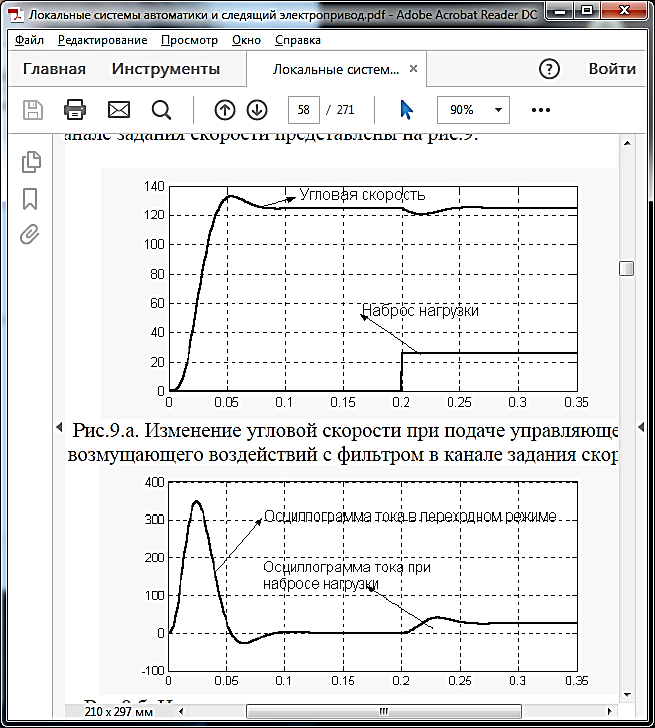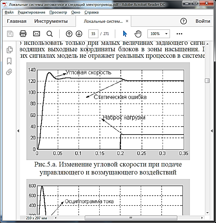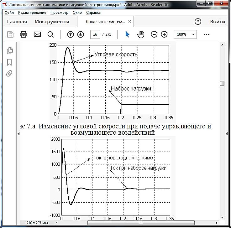 Як і слід було очікувати, перерегулювання зросло до 53,5%. Астатична помилка за збуренням дорівнює нулю (Рис.6.а). Система з ПІ-регулятором швидкості розглядається як лінійна: в ній не враховано ефект насичення.