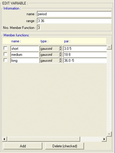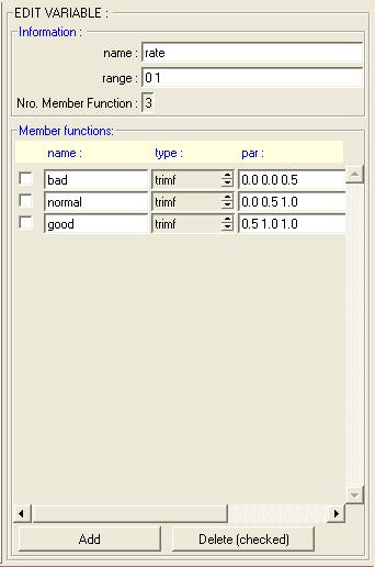 В ньому необхідно задати ім'я та діапазон допустимих значень. За допомогою кнопки Add внизу вікна додати функції приналежності. Їх можна також видаляти, помітивши клацанням миші і натиснувши кнопку Delete (checked).