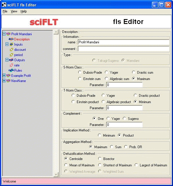 Спочатку вибираємо в ньому пункт Description і заповнюємо форму, що з'явилася справа. У ній необхідно вказати ім'я системи, що редагується, коментарі (не обов'язково), види T-норми і S-конорми, тип операторів доповнення, імплікації, агрегації і метод дефазифікації.