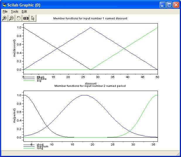 Крок другої. Кожній вхідній і вихідній змінній поставимо у відповідність набір ФП. Для discont визначимо діапазон базової змінної від 5 до 50 (одиниця вимірювання – відсотки). Такий же діапазон оберемо для її відображення. Додамо три ФП, тип яких – trimf, і привласнимо їм найменування – small, middle, big, які відповідають невеликій, середній і великій ставці дисконтування (рис. 2).