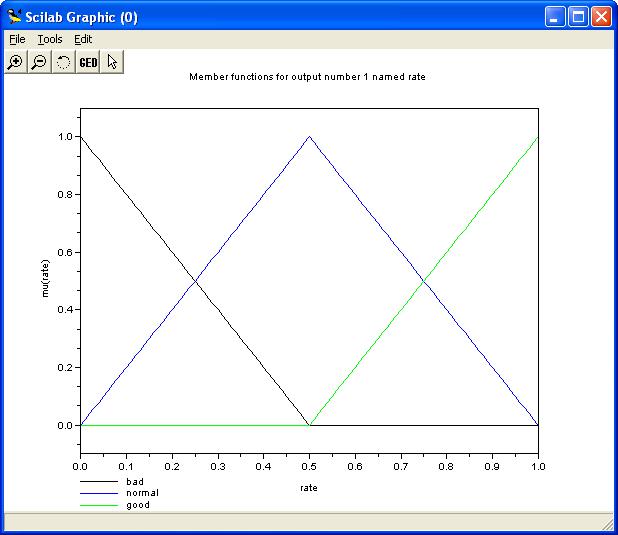 Нарешті, для змінної rate визначимо: базова змінна змінює значення в діапазоні [0, 1], семантика описується трьома ФП типу trimf з найменуваннями: bad, normal, good (рис. 4).