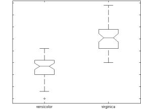 ∙Зазубрины показывают вариабильность медианы между выборками. Ширина зазубрины вычисляется, поэтому те коробочки, чьи зазубрины не перекрываются (как изображено выше) имеют различные медианы при уровне значимости 5 %. Уровень значимости основан на допущении нормальности распределений, но сравнение медиан достаточно робастно и для других распределений. Сравнение boxplot-медиан похоже на визуальную проверку гипотез, аналогичную t-тесту, используемому для средних.