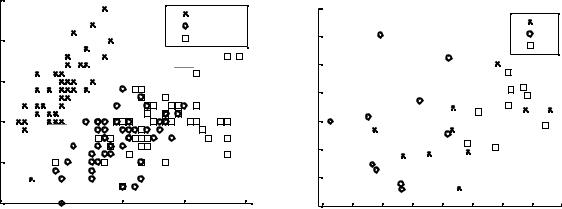 Для целей визуального сравнения данных нескольких групп объектов по 2 признакам используется диаграмма рассеяния по группам (функция gscatter). Она определяется следующим образом.