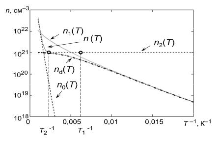 На рис. 5.4 в логарифмическом масштабе приведены графики представленных ранее зависимостей, а также температурной зависимости полной концентрации электронов для донорного полупроводника.