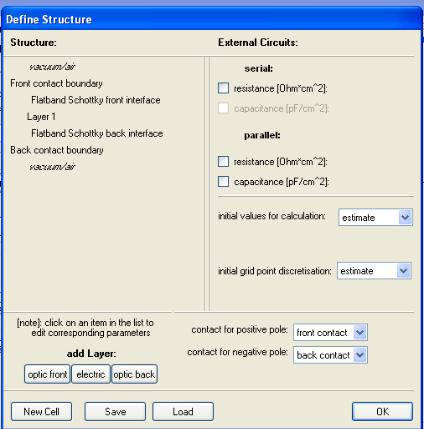 Первый шаг при запуске AFORS-HET обычно заключается в задании структуры, которую необходимо моделировать. Структура всегда состоит из верхнего контакта, тыльного контакта и переменного числа промежуточных слоев (по крайней мере, одного). Между всеми этими элементами находятся границы раздела – интерфейсы, которые по умолчанию отключены (модель дрейфово-диффузионного транспорта для границ раздела). Структура кроме того содержит оптические слои, которые определяют поглощение света, отражение и пропускание в контактах структуры. Также могут быть заданы внешние схемы, т. е. последовательное сопротивление (Rs), последовательная емкость (Cs), параллельное сопротивление (Rp) и параллельная емкость (Cp).