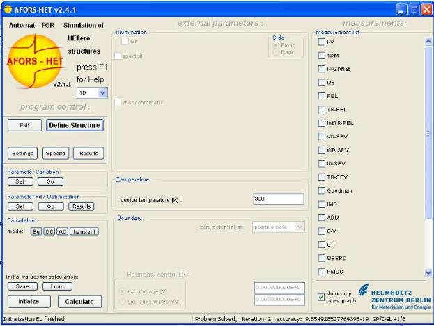 В работе для компьютерного моделирования было использовано программное обеспечение AFORS-HET v2.4.1., разработанное для моделирования многослойных фотопреобразовательных гетероструктур. Данный программный продукт был разработан в Центре Гельмгольца (Helmholtz-Zentrum Berlin für Materialien und Energie GmbH) и находится в свободном доступе [http://www.helmholtz-berlin.de/forschung/enma/si-pv/projekte/asicsi/afors-het/in- dex_en.html] [2]. Программа производит численное решение уравнений непрерывности и уравнения Пуассона для каждого слоя, используя различные граничные условия и внешние воздействия (приложенное напряжение, освещение). В результате расчета может быть построена зонная диаграмма, определены основные характеристики солнечных элементов и смоделированы результаты различных электрофизических измерений, что позволяет в полной мере проводить анализ полученных экспериментальных результатов.