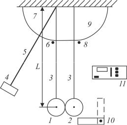 ленных на бифилярных подвесах 3. Длины бифилярных подвесов от оси их подвеса до центров масс шаров одинаковы и равны L. Шар m1 может удерживаться в отклонен-