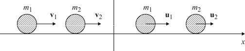В этих уравнениях v1, v2 и u1, u2 – это проекции скоростей тел на выбранное направление оси проецирования x, имеющие знак . Если при расчетах будет полученоui 0 i 1, 2 , это означает, что вектор скорости тела ui после столкновения тел направлен противоположно выбранному направлению оси x.
