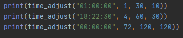 Решение: Для решения задачи воспользуемся встроенной библиотекой datetime, а точнее методами strptime, strftime класса datetime и функцией timedelta. Код функции time_adjust() представлен ниже: