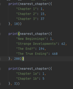 Задание 2: Создать функцию, которая вернет ближайшую к текущей страницы главу. Если две главы одинаково близко, то выбирается та, которая находится на большей по порядку странице.
