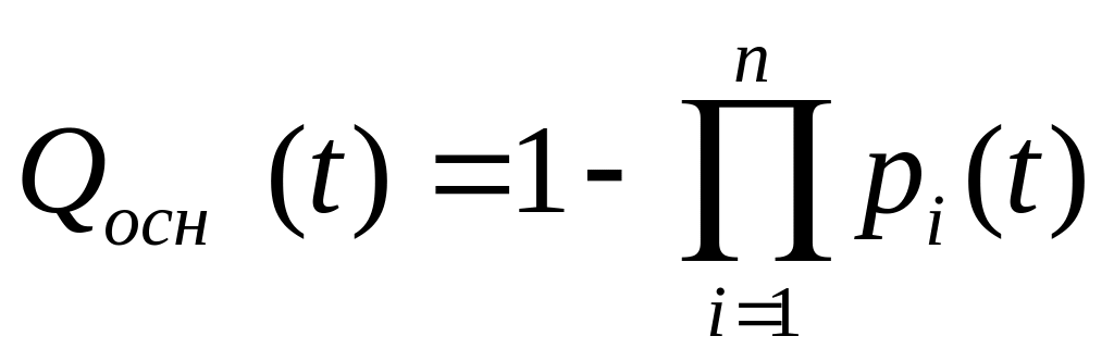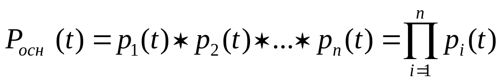 Вероятность безотказной работы ТО при основном соединении Росн(t) равна произведению вероятностей безотказной работы отдельных элементов pi(t) в течение того же времени (8):