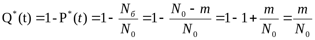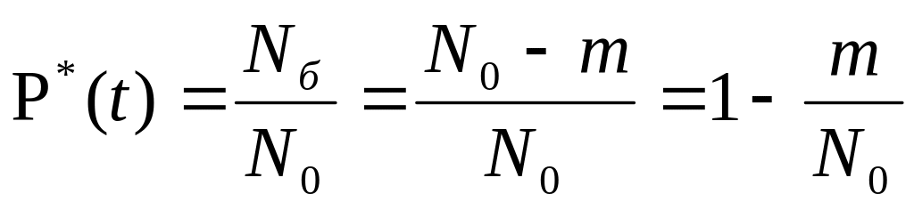 Вероятность безотказной работы статистически (P* (t)) определяется отношением числа однотипных средств (элементов) Nб , безотказно проработавших до момента времени t, к числу средств N0, работоспособных в начальный момент времени t=0 (1).