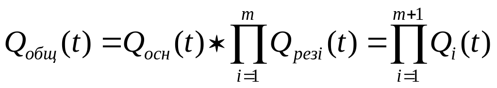 Расчет безотказности ТО при резервном соединении элементов ведется следующим образом. Поскольку при общем резервировании отказ ТО наступит при отказе всех резервных и одного основного элемента, то при наличии резервных цепей вероятность отказа ТО Qобщ(t) будет равна произведению вероятностей отказа основной Qосн(t) и резервной Qрезi(t) цепей (13):