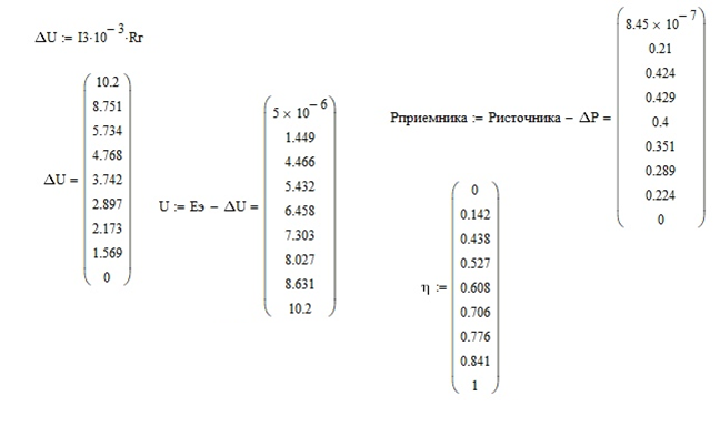 Кривые, построенные по экспериментальным данным, сошлись с теоретическими кривым. Мощность и КПД источника линейно зависят от тока, мощность потерь и кривая выделяемой мощности – параболически.